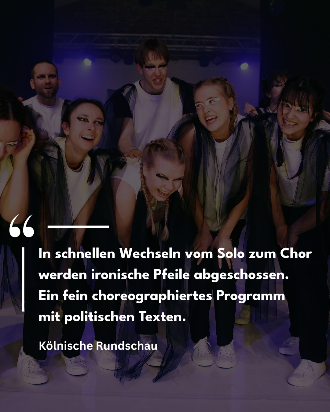 Es spielen: Milena Chotjaturat, Hebûn Jîn Ertaş, Nele Meret Fischer, Linus Gomolka, Eda Kurt, Kevin Leske, Ibtisem Midani, Jana Münster, Renée Michelle Touschong, Eina Welsch, Kim Lana Westhagenmann, Lavinia Zubanovic & Gäste
