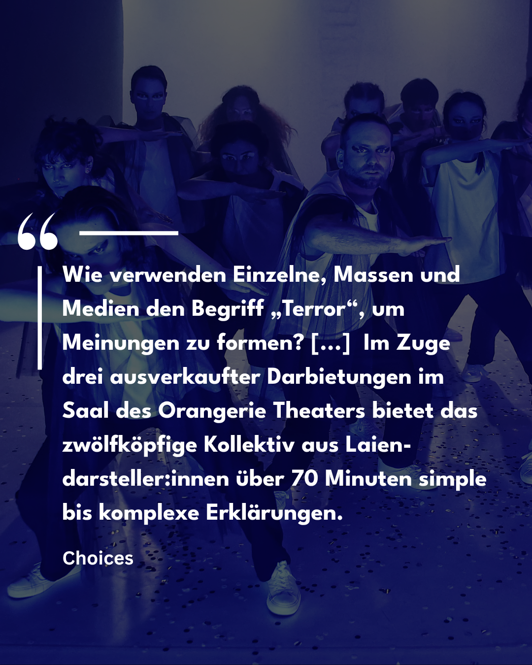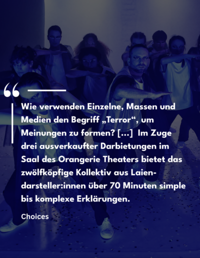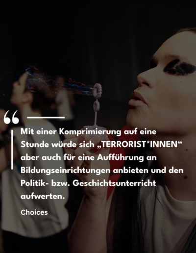 In einem 7-monatigen Bootcamp Programm, das aus Wochenendworkshops bestand, konnten wir die Mitglieder aus- und weiterbilden. Als Abschluss dieses Programms wurde das Stück TERRORIST*INNEN entwickelt.